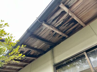 今回は、ベランダの雨樋取付が悪かったことで雨漏りがおこり、垂木や座板(木材)が傷み、屋内にも雨が漏ってしまっている屋根の解体、修繕工事をしました。